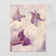 vintage feira pintura de fadas de chuva chuva chuva chuva chuva fazer chuva enquanto se sentam sobre grandes nuvens brancas fluffy no céu vestindo púrpura, mauve, e manchas liláticas com capuzes e segurando um objeto metálico plano redondo com chuva caindo dele em chuva pesada. ilustração de aquarelas bonitas e bonito com cabelos varridos pelo vento e manchas capuzes estão ocupadas nuvens de terra. linda e doce ilustração deliciosa em púrpuras, mauves e lilases.
