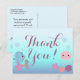 Agradeça amigos, familiares e convidados com este cartão de agradecimento de chuveiro de bebê. Celebre a bebê com um divertido tema de animais marinhos oceânicos! Perfeito para um chuveiro de bebê à beira-mar ou apenas um tema de água da natureza. Água-marinha, jellyfish rosa coral e roxo, baleia, peixe, cavalo-marinho, estrela-do-mar, conchas e bolhas. O cartão de agradecimento de Chuveiro de Bebê é ótimo para a menina feminina com um toque de moda e estilo moderno.