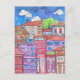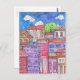 Cidade do rabisco. Casas e árvores desenhadas à mão, céu azul e nuvens. Ilustração de Aquarela.