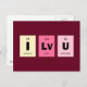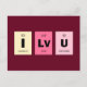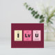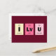 Então este é o cartão para você. Um de nossos desenhistas muito inteligentes (e nerdy) veio acima com este eu te amo design engraçado usando elementos da mesa periódica. Geeky bastante para você! Os elementos da mesa periódica são mostrados em cores cor-de-rosa e violetas sassy sobre um fundo vermelho escuro. Retro legal, super super!