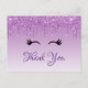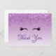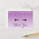Cartão de agradecimento com um design elegante e moderno. O fundo é uma cor gradiente roxa com brilho falso cintilante pingando do topo. Um par de cílios fofos e femininos sob o brilho.
