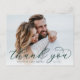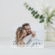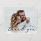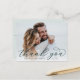 O obrigado de casamento elegante que vocês postcards apresentam uma foto de casamento horizontal ou orientada para a paisagem com "Obrigado" sobreposta na parte inferior do guião de caligrafia verde. Personalize com seus nomes e data de casamento em caracteres clássicos de bloqueio e adicione uma mensagem pessoal e uma assinatura no verso.