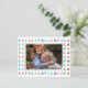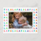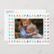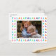 Cartão de Férias Único, clássico, de moda, bonito e decorativo. Feriados Felizes Gratos saudando texto e espaço para personalizar ou personalizar com uma foto, nome da família (ou nomes individuais) e mensagem de sua escolha. Enquadrado pela colorida arte das palavras FA LA num fundo branco.