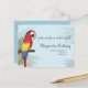 Esta design apresenta um belo partido de animais de aves selvagens, uma piscina de praia tropical ao ar livre, uma linda fauna de papagaios coloridos, um moderno minimalista simples, um roteiro de caligrafia na moda, uma folha de palmeiras botânica, com folhagem verde tropical, convites de festas engraçadas e engraçadas, uma simples festa de aniversário de verão divertida, uma ilha de paraíso botânico amigável cartão postal