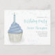 Este design apresenta um convite de cupcake giro para crianças azuis com velas azuis de aniversário salpicadas azuis, com um código QR para mais informações e o URL da sua festa. uma festa divertida, um roteiro de caligrafia na moda, um doce doce doce doce bolo de sobremesa criativo, com cores pastel cores tipografia, um adorável convite para crianças festas de aniversário, um estilo de glacé de água, um bolo de cupcake tema para crianças festa de aniversário orçamento favorável convites postais