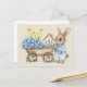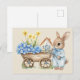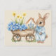 Apresentando nosso Coelhinho Personalizado com Cartão-Postal Azul! Com um pequeno coelho segurando flores silvestres azuis, um carrinho de madeira com muitas flores silvestres azuis e uma pequena casa no fundo, este cartão-postal é o mais doce!