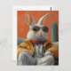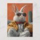 Um coelho senta-se num sofá vestindo uma roupa listrada e uma arte de fantasia jaqueta amarela