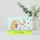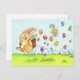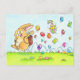 Envie esta Páscoa para amigos e familiares para lhes desejar uma Felz pascoa. Neste cartão, um coelho de páscoa bege está pulando da direita para a esquerda. Ele é carregando cesto nas costas do qual ele pega ovos de páscoa em todas as cores, que ele cai na grama à medida que passa. De um desses ovos, um pequeno pintinho é o voo de médio para incubação. Parece surpreendido e não muito surpreendido com a situação.