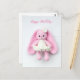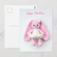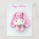 Um coelho rosa macio e terno com orelhas compridas e caídas e um vestidinho branco traz calor e doçura a este cartão de aniversário. Suave, fofo e cheio de charme, é uma maneira adorável de compartilhar alegria e afeto no dia especial de alguém.