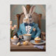 Coelho num casaco azul a tomar chá da tarde