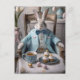 Coelho num casaco azul tendo chá da tarde