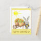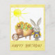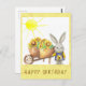 Deseje um feliz aniversário à sua família e amigos com este cartão postal fofo com uma ilustração de girassol amarelo, carrinho de mão e coelho!