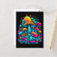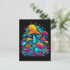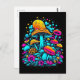 Arte neon colorida com cogumelos e flores azuis e cor-de-rosa e um fundo preto.