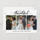 O obrigado de casamento moderno elegante que você postcard mostra 3 fotos de casamento em um layout de colagem, com um roteiro de caligrafia "agradecido" em preto sobre fundo branco. Personalize com seus nomes e adicione um obrigado personalizado que você envia e assina no verso.