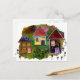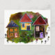 Arte de Marta Harvey. As casas foram criadas com papéis pintados feitos com técnicas diferentes e revestidos com canetas de gel. O fundo foi feito com toalhas de papel pintadas. As flores foram feitas com um furo redondo perfurado sobre papéis pintados e depois as pétalas, folhas e caules desenhados com caneta e tinta.