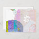 Uma colagem de abstrato de inspiração retrógrada de flores de paparia brancas contra cinza e fundo de lavanda, com embelezamentos amarelo neon, roxo e turquesa.
