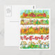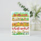 Um cartão postal colorido com filas de vegetais de colheita, abóboras, abóboras fantasmas, bagas e casas vermelhas desenhadas a tinta com aquarela para a temporada de outono. Boa maneira de desejar aos amigos e à família um feliz outono!