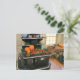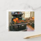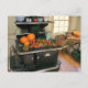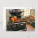 Este cartão apresenta um antigo fogão de lenha Glenwood carregado com uma colheita de verão de squash e tomate.