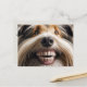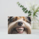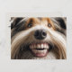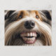 Um close de um cão Collie barbudo e pelado, cheio de pele, mostra-o humoramente sorrindo com dentes parecidos com humanos. Todo o texto pode ser alterado.