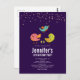 Convite de aniversário de cartão-postal com um trio de pássaros fofos e caprichosos desenhados à mão. 2 dos pássaros estão juntos com algumas pequenas árvores de pinheiro verdes entre os pés. Outro pássaro azul está voando entre eles. Definido em um fundo roxo. Imagem de confete rosa-dourado falso no topo.