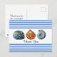 Este cartão postal estilo Praia apresenta três conchas marinhas em um fundo listrado azul e branco. Há um espaço para uma saudação. Compre como mostrado com a saudação de agradecimento ou adicione seu próprio texto, como "Salve a Data" ou "Feliz Aniversário". A escolha é sua. Há uma saudação no verso que pode ser personalizada com suas próprias palavras.