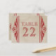 Na moda e chic Elegant Deco Wedding Table Number Cartão postal com um par de espiral de arte deco floresce em vermelho escuro e uma imagem de fundo texturizada em um bege suave. Este cartão de mesa tem charme rústico enquanto mantém um belo talento sofisticado. Absolutamente perfeito para o casamento temático vintage de 1920. Fácil de personalizar, basta adicionar o(s) número(s) de tabela apropriado(s) no campo de texto fornecido. Clique em "Personalizar" para encontrar opções adicionais de personalização.