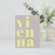 Envie uma saudação elegante de Viena, Áustria, com este cartão postal tipográfico moderno. O design apresenta a palavra Viena dividida em três linhas em letras minúsculas decorativas e em negrito, em amarelo brilhante sobre um fundo cinza. Acima, a frase saudações de é escrita em uma fonte sans serif fina e elegante, adicionando um toque sutil e moderno. Perfeito como um souvenir de férias, um enfeite decorativo ou para enviar para casa a partir da sua cidade favorita. Um design minimalista, porém atraente, para os amantes de estética contemporânea e lembranças de viagem.