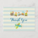 Um obrigado de chá de fraldas que você faz (pode ser personalizado para se adequar a outras ocasiões também). Projetado com crianças bonitinhas, ilustrações da arte infantil temidas de um pequeno cão andando em um avião e um trem de brinquedo cheio de bichos. Colocado sobre um fundo listrado de creme e azul. Mensagem no verso que pode ser personalizada ou deixada como está.