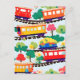 Trens bonitos em trilhos com árvores grandes em fundo azul.