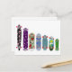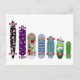Uma ilustração com uma gama de painéis de skate definida por ordem de tamanho. Estes têm gráficos coloridos. Há uma faixa de pequenos conselhos de plástico até palangreiros de cauda fina.