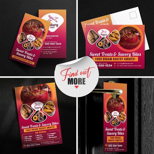 Tente os clientes com este modelo de cartão postal de padaria apetitoso! Mostrando uma variedade deliciosa de guloseimas doces e salgadinhos, é perfeito para promover as diversas ofertas da sua padaria. Personalize-o facilmente com seu logotipo, itens do cardápio e informações de contato. Ideal para padarias, cafés e empresas de alimentos de todos os tamanhos! Comece hoje mesmo e atraia os clientes com suas criações irresistíveis!
