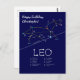 Constelação do Zodíaco Leão ou leão. A cor das estrelas é aproximadamente real. Nomes de estrelas e objetos espaciais. De acordo com a mitologia grega, este é o Leão da Nemeia que foi morto por heracles (Hércules para os romanos). O caso é considerado o primeiro dos doze trabalhos de heracles. O leão era invulnerável às armas da época, então Heracles teve que derrotar o Leão com as mãos nuas. Zeus comemorou este trabalho colocando o Leão (ou a pele do leão?) no céu. Leão é uma das constelações do zodíaco e uma das maiores constelações no céu. O Sol transita a área ao longo da linha da Eclíptica entre 23 de julho e 22 de agosto. Saudações de aniversário únicas, elegantes e engraçadas para qualquer um. Personalizável. Você pode alterar a imagem e o texto do modelo "Feliz aniversário, Christopher!". Você pode transferir este design para uma variedade de outros produtos. Basta escolher o produto a partir da opção rolável "Transferir design para um produto". Não se esqueça de usar o botão "Personalizar", ou "Editar design", ou o link azul "Detalhes" --> "Clique para personalizar ainda mais" --> "PREENCHER/AJUSTAR" para AJUSTAR O DESIGN AO TAMANHO E FORMA do produto, para girá-lo, para alterar a