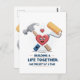 Celebre sua jornada de amor e serragem! Este design encantador e engraçado apresenta um personagem de coração feliz com um martelo cruzado e um rolo de pintura, capturando perfeitamente o espírito de trabalho em equipe em um relacionamento. A citação "Construindo uma vida juntos. Um projeto de cada vez", é um gesto doce e humoroso para os casais que se unem através da melhoria da casa, reformas e projetos DIY.