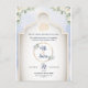 Celebre seu dia especial com graça e tradição usando este belo cartão de convite ao casamento islâmico. A design apresenta elegante caligrafia árabe de "Bismillah ir-Rahman ir-Rahim", enquadrado num delicado arco ao estilo mesquita com sotaques florais suaves e detalhes dourados.