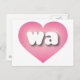 Este cartão-postal apresenta um coração cor-de-rosa com um centro lavado em branco contendo as letras maiúsculas em negrito, branco e arredondado, uma abreviação lúdica para Washington, o estado verde-vivo. O reverso da placa é vazio, aguardando seus sentimentos manuscritos ou texto personalizado.