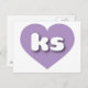 Este cartão-postal apresenta um coração lavanda em forma e vibrante contendo as letras maiúsculas, brancas, em negrito, arredondadas, uma abreviação lúdica para Kansas, o estado do girassol. O reverso do cartão postal é vazio, aguardando seus sentimentos manuscritos ou texto personalizado.