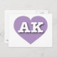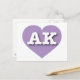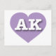 Este cartão postal apresenta um coração de lavanda suave contendo as letras maiúsculas brancas em negrito AK, a abreviação oficial do Alasca, a última fronteira. O verso do cartão postal está em branco, aguardando seus sentimentos manuscritos ou texto personalizado.