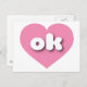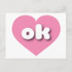Este cartão-postal apresenta um legal e calmo coração cor-de-rosa contendo as letras maiúsculas brancas, em negrito, arredondadas, ok, uma versão lúdica da abreviação para Oklahoma, o estado mais rápido. O reverso do cartão postal é vazio, aguardando seu texto personalizado ou sentimentos escritos à mão.