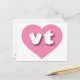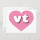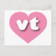 Este cartão-postal apresenta um coração cor-de-rosa tranquilo e legal contendo as letras maiúsculas vt, brancas, arredondadas e em negrito, uma abreviação lúdica para Vermont, o estado verde da montanha. O reverso do cartão postal é vazio, aguardando seus sentimentos manuscritos ou texto personalizado.