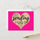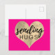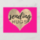 Cartão postal rosa quente enviando abraços com um coração de aquarela dourada no centro contra um fundo rosa sólido da moda.