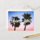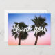 Filtro azul e cor-de-rosa cor-de-rosa numa foto de duas palmeiras. A tipografia "obrigado você" apresenta um roteiro moderno de caligrafia. Crie seu próprio obrigado de destino de casamento tropical ou Califórnia.