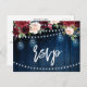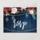 Design floral branco-vermelho-escuro, cor-de-rosa-rosa, cor-de-rosa, com luzes de corda e modelo de cartão RSVP de pedras com folhagem botânica verde e folhas de eucalipto em fundo de madeira. Esta design fácil de personalizar pode combinar facilmente com as cores do casamento, estilos e temas e é uma escolha perfeita para os casamentos no meio do outono ou no inverno. Você pode encontrar mais designs correspondentes na minha loja ou entrar em contato comigo se precisar de ajuda na personalização do design.