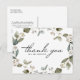 Cartão de agradecimento tema de folhagem rústica para o seu evento. Apresenta coroa de folhas de eucalipto com sementes em aquarela. Personalize adicionando nomes, endereço de retorno e mensagem. Este cartão de agradecimento de folhagem rústica é perfeito para casamentos de verão, chás de bebê e muito mais.