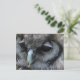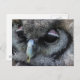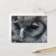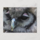Cartão-postal com uma macro foto de uma coruja de cinzas bonitinha com pálpebras cor-de-rosa.