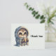 Obrigado postal com uma ilustração fofa de uma coruja de olhos grandes num roupão de inverno e cachecol segurando um café quente.