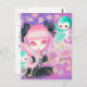 Menina kawaii bonita com rabos-de-cavalo cor-de-rosa esfolados amarrados com arcos pretos, com dois adoráveis corujas azuis aqua, estrelas mágicas e folhas de outono pastel.