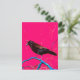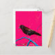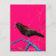 Retro Raven com fundo rosa quente. Retrato digital pintado em azul, preto e néon rosa. Raven tocava em galho de árvore com o céu ao fundo. Pássaro Negro Rosa Quente