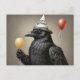 Este é um design gerado por IA. O chapéu de aniversário que o corvo está usando tem o texto feliz aniversário. E eu achei engraçado o corvo estar segurando o balão amarelo.