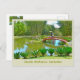 Um dia maravilhoso no lindo Jardin Bontanico Lankester na Costa Rica. Um cupê com guarda-chuva caminha sobre a pequena ponte vermelha arcaica sobre o lago, cercado por uma exuberante vegetação.