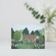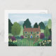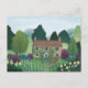 Apresentando uma ilustração encantadora de uma charmosa cabana aninhada em meio a uma exuberante vegetação e flores vibrantes, este cartão postal evoca uma sensação de vida pacífica no interior.